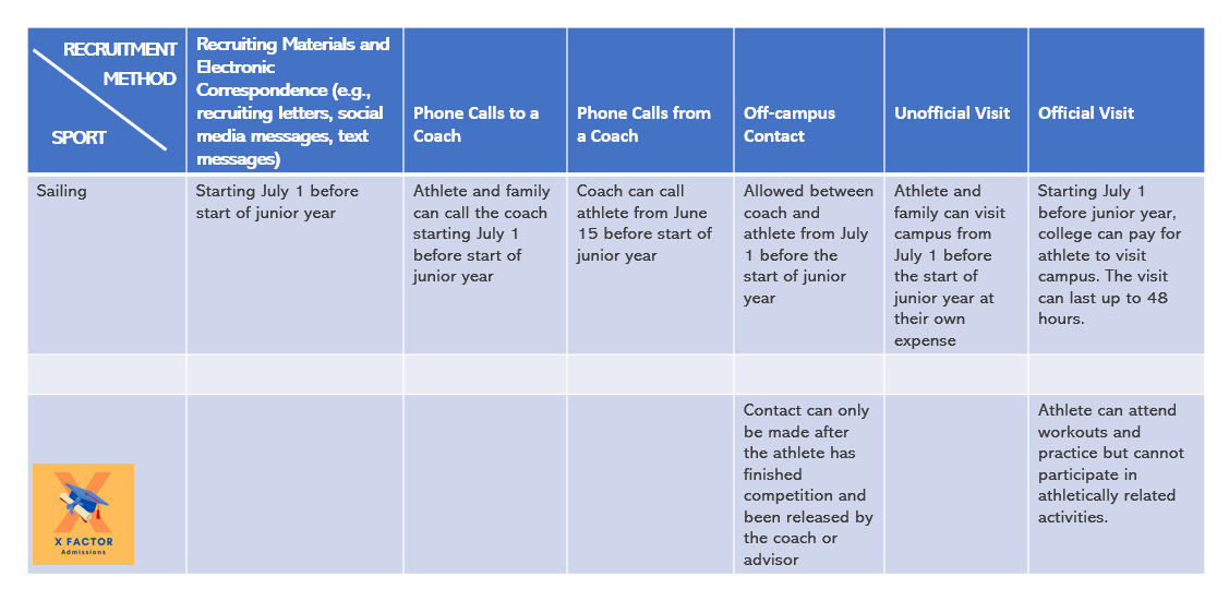The rules of athlete recruitment resemble those set by the NCAA with restrictions on when discussions about sailing athlete recruitment can begin between the high school sailor and the varsity sailing coach. These rules are in place to create a level playing field in athlete recruitment and ensure that every athlete has an equal opportunity to access athlete recruitment in college. The rules are also designed to ensure that an athlete is not pressured into prematurely into accepting an offer of recruitment before they have had a chance to explore all opportunities.
